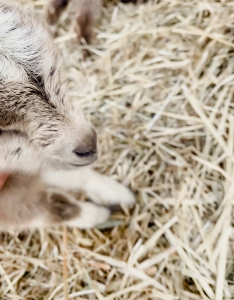 The vet came out to our car and I told him what I thought was wrong. He said “I’d be surprised if there was still a baby in there after 3 days, but we’ll check.” He gloved up and we put her on the ground and he reached in and felt around while I held and comforted her in front. She was so quiet and still, and the assistant vet said what I was thinking, that she seemed to know we were trying to help her. The vet said there was “definitely something in there”. The big kids turned their heads away so they wouldn’t see, Perry, my toddler, stared and watched the whole thing. I held onto Jo and pulled her forward with all my might (enough to make me fiercely sore the following day), the assistant held her hips and the vet pulled and pulled. He said several times “she’s just SO small”, indicating it was difficult for him to get a firm grasp on whatever was inside her. I was praying out loud, whispers at first then louder as it became more intense and Josephine was showing so much discomfort. At one point when we were all straining the vet said “keep praying!” Several seconds later he pulled out the dead baby goat.