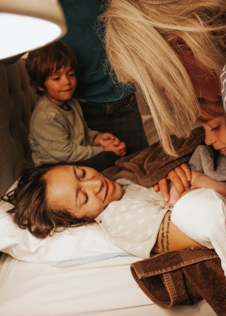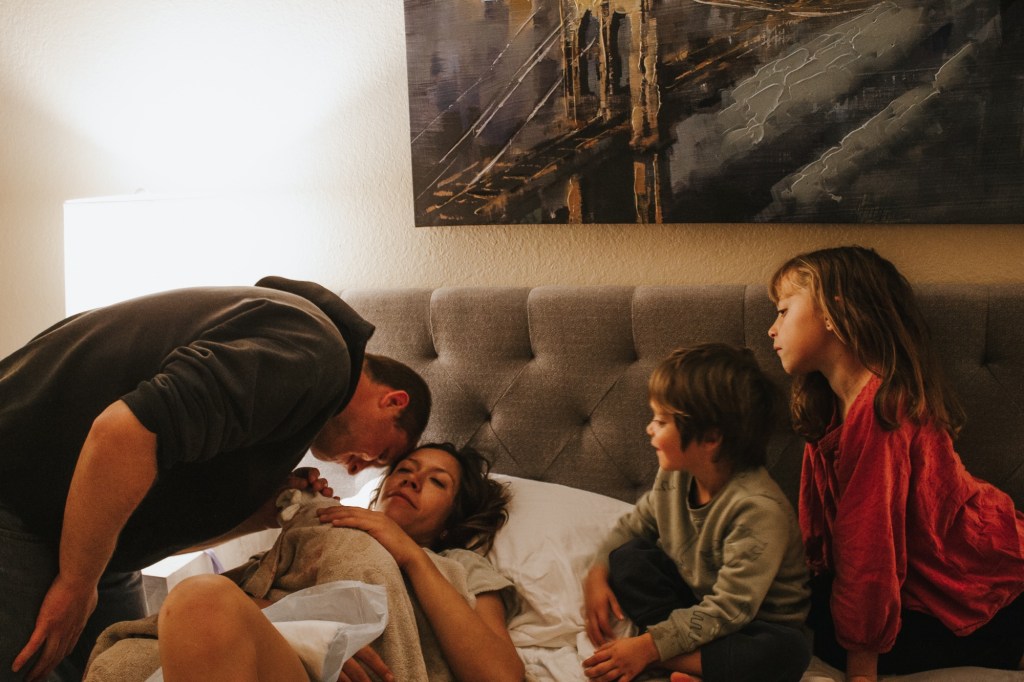 We had a beautiful golden hour, at 2 in the morning. Everyone who had been sleeping- my kids and friend/sisters woke up when they heard me pushing and came in when they heard her cry. I had pictured everyone being there when she was born, the kids in particular, but was glad they weren’t, it was so, so intense and I think would’ve been hard for them to handle. But having them there right away afterwards was perfect. My sister took beautiful pictures; everyone was so happy and supportive and encouraging. I held my baby on my chest, with everyone around just pouring out love. We waited for the placenta to come out before Justin cut the umbilical cord. Perry told us not to cut the cord and was so worried about us hurting the baby, but we assured him it wouldn’t hurt. I took a shower and my midwife and doula got the bed made fresh, and Justin fell immediately asleep as soon as he could.