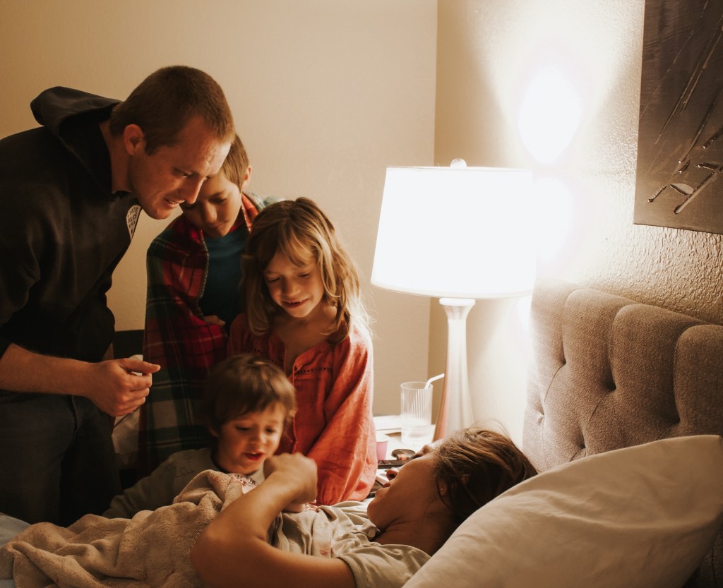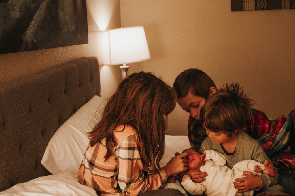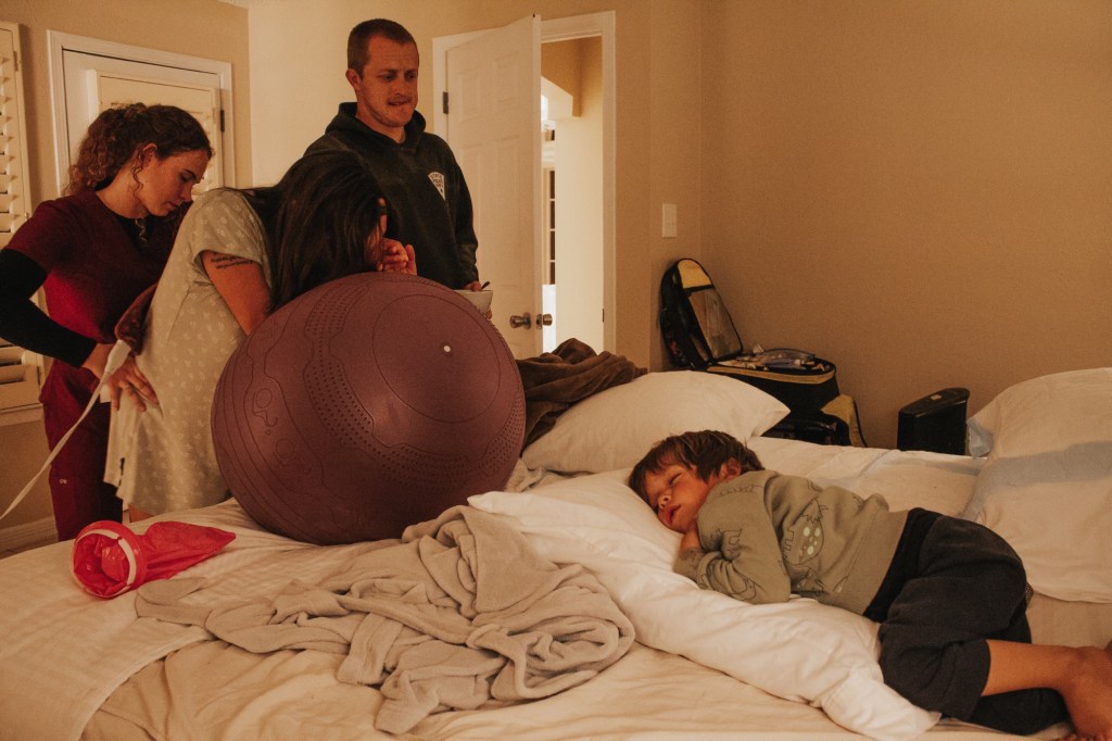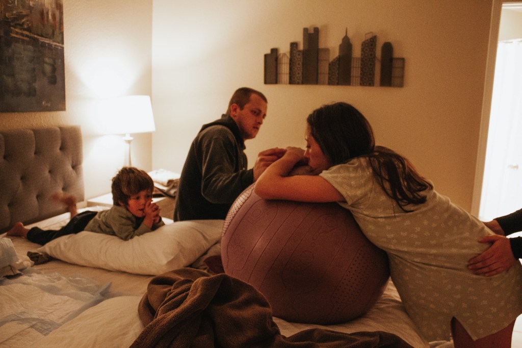 Between contractions I was able to chat and laugh. My kids would come in occasionally and “check on” me. As the day turned to night, Perry, my three year old, was in the bedroom with us a lot, seemingly unfazed by the groans and growls I made every few minutes. My older two were out in the living room with my sister, Heather, sister-in-law, Darleen, and friend, Sarah. Perry would often go out with them too. Sarah said afterwards that Leo, my oldest, was very brave and level-headed through it all. They would all hear me have an intense contraction and Leo would say something like “we’re making progress”. I had talked to them a lot ahead of time to prepare them for me being in labor, and I’d told them that I needed to have strong contractions in order for the baby to come. My daughter Lyla had a harder time with hearing me in pain and eventually went into another room with Sarah and read. What a blessing it was to have so much support, not just for me but also for my kids.