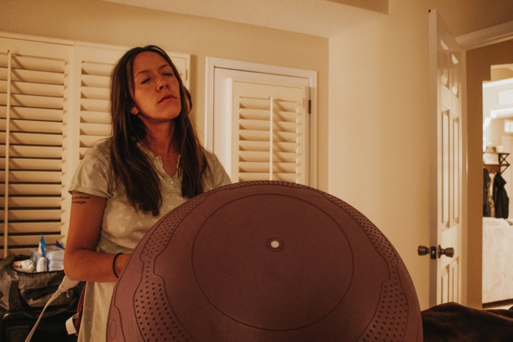 I labored walking around the sunny backyard and got settled in. I laid down to rest for a little while. Even though being in labor was so hard, I was thankful to be in a home with my family around me. All morning the contractions had been between 7-14 minutes apart and strong but I could focus and breathe through. They took concentration to get through and were intense and uncomfortable but I was staying very positive and excited and had an “I can do this” mindset. They grew closer and stronger after a couple hours at our Airbnb, and I told my doula, friend, sister, sister-in-law and midwife to come. They seemed to get closer quite suddenly and I worried people might not make it, my doula being an hour away and my friend and sisters two hours away. But, little did I know, everyone still had plenty of time.