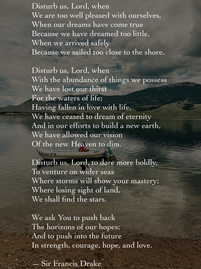 The point is that if we want ease more than Jesus, or security in this life more than eternity, we are on dangerous ground. I know I find myself feeling stale and complacent in prayer and in faith sometimes when life is “comfortable”. This poem speaks to that and asks God to disturb- disrupt, turn over, interfere with- our complacency so we may seek first His kingdom, knowing that when we do that, “all these other things will be added as well” (Matthew 6:33).