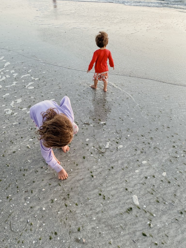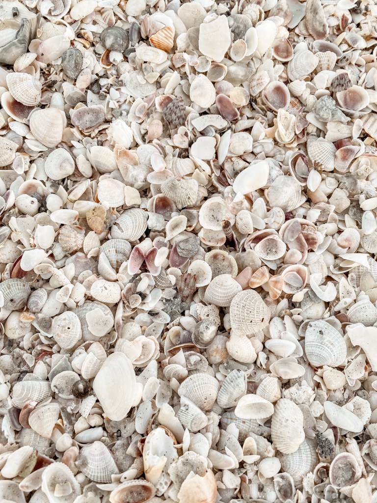 The sand on Indian Rocks Beach is white- in the pictures we took it looks like were standing in snow. The reason it’s white is because it’s made of shells. Billions and millions of pale, sun-bleached shells pounded by those endless waves until it produces a fine powder almost as soft and cushiony as snow. And year after year this process keeps happening, little by little. So there are tiny particles of shells along with small chunks of shells, then larger pieces broken up that are on their way to becoming sand.