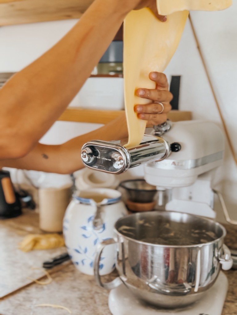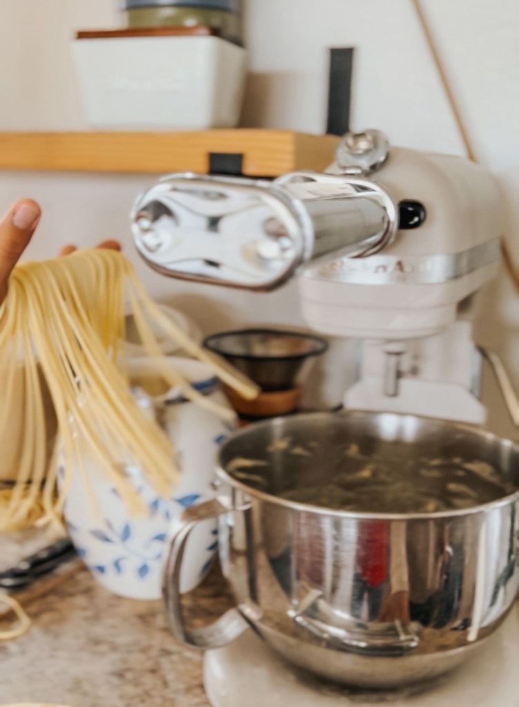 I first made them purely by hand, which was doable but more time consuming than ideal for me. But they were SO delicious, and of course more nutritious and affordable than store bought, that we decided to get a Kitchenaid pasta tool (I LOVE my Kitchenaid mixer!). Now it’s super easy and quick!