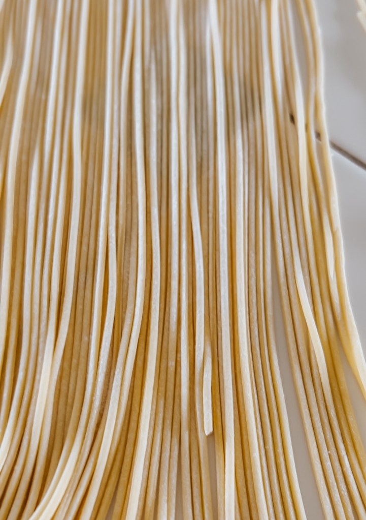 -As the dough comes out pasta, lay it on a flat counter. Let it dry there if not using right away.