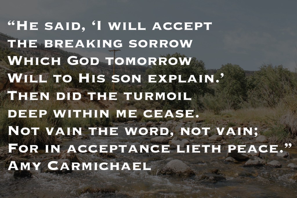 Amy Carmichael was a missionary who rescued and gave hope to more than a thousand children in India. Her work and words are inspiring, poignant, and brilliant. Here’s a poem of hers entitled In Acceptance Lieth Peace: