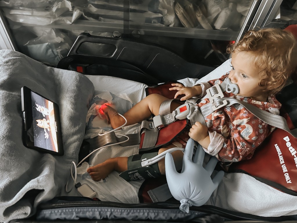 The ambulance ride was better, though Willa did fuss, having to be confined in the stretcher. The EMT put Bluey on his tablet for her to watch and made her two latex glove “balloon toys”.