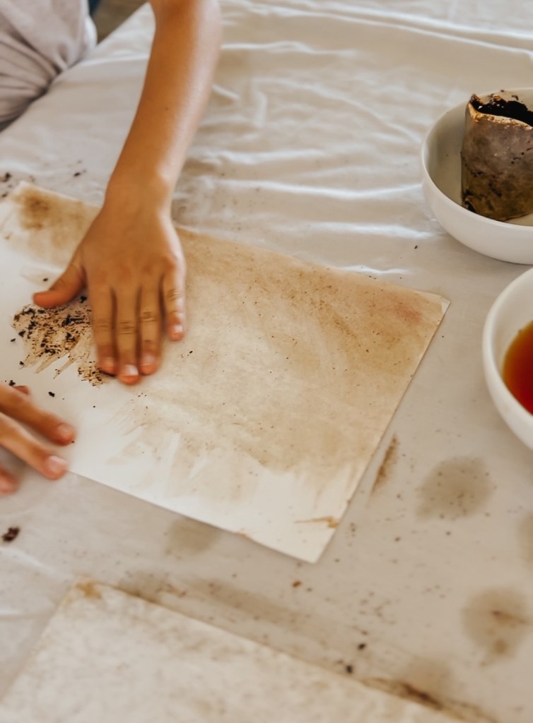 Experiment by using different strength brews, sprinkling/rubbing coffee grounds, or dabbing tea bags on papers