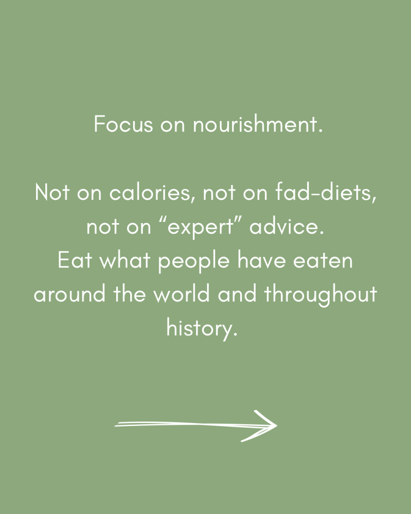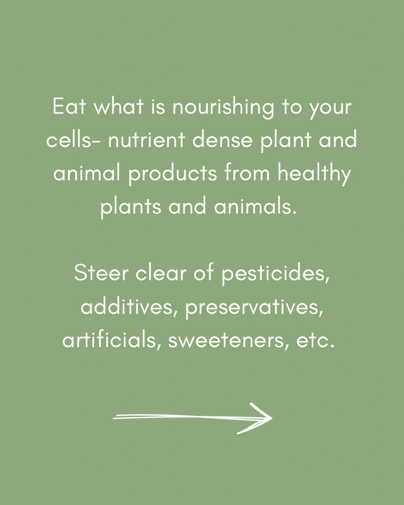 Eat what people have eaten around the world and throughout history. Eat what is nourishing to your cells- nutrient dense plant and animal products from healthy plants and animals. Steer clear of pesticides, additives, preservatives, artificials, sweeteners, etc.